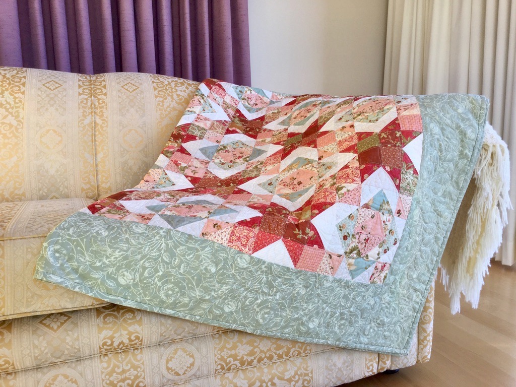 Here are some more jelly roll quilts. The pink one is a disappearing 9 patch and the softer apricot and green one is from ‘Jelly Roll Quilts’ by Pam & Nicky Lintott – ‘Twin Stars’ design.