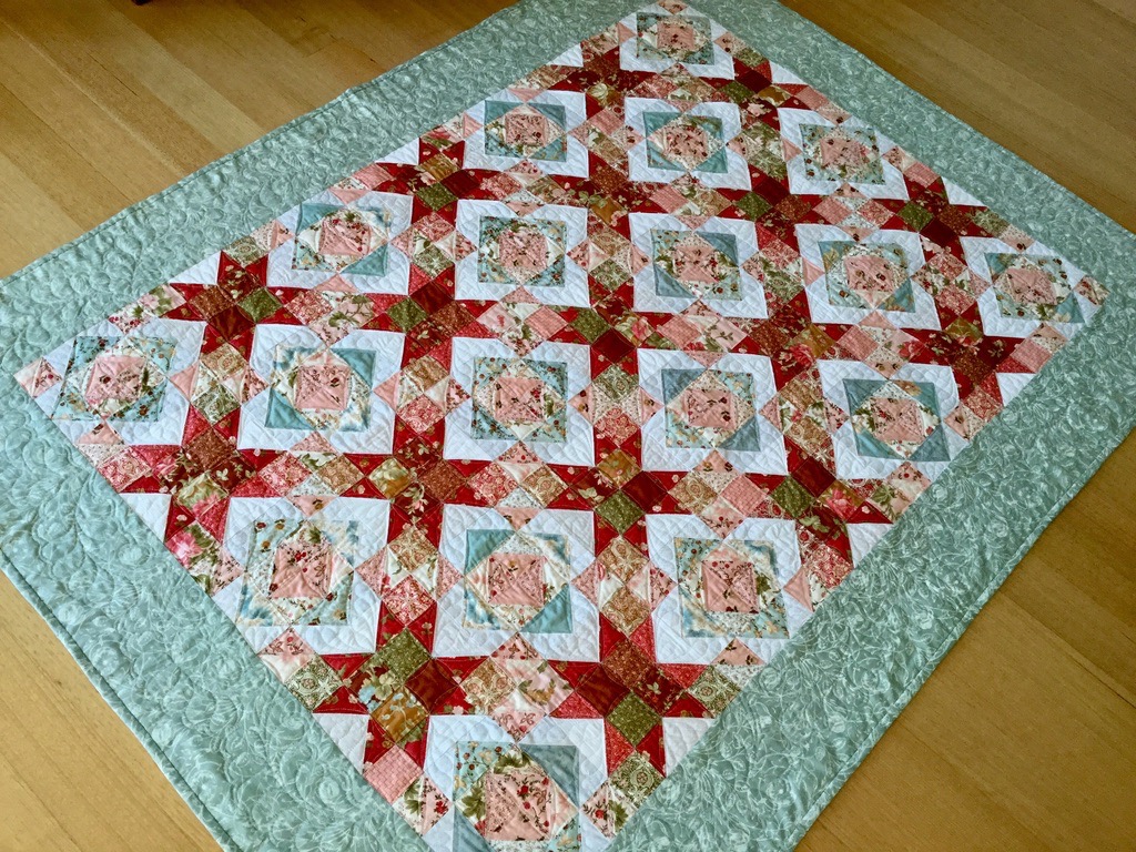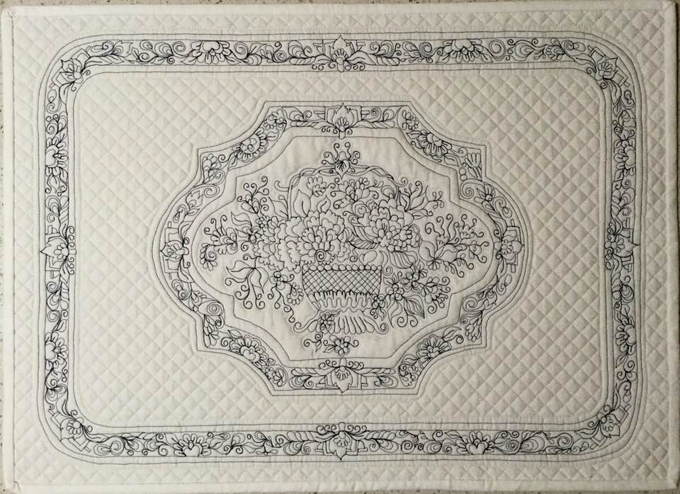 I like the soft feathers used to fill the borders. Machine pieced then custom quilted on my Sweet 16 using Superior threads ‘Magnifico’.