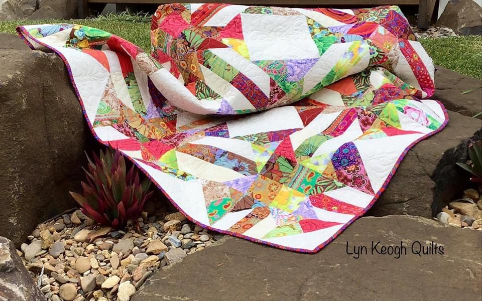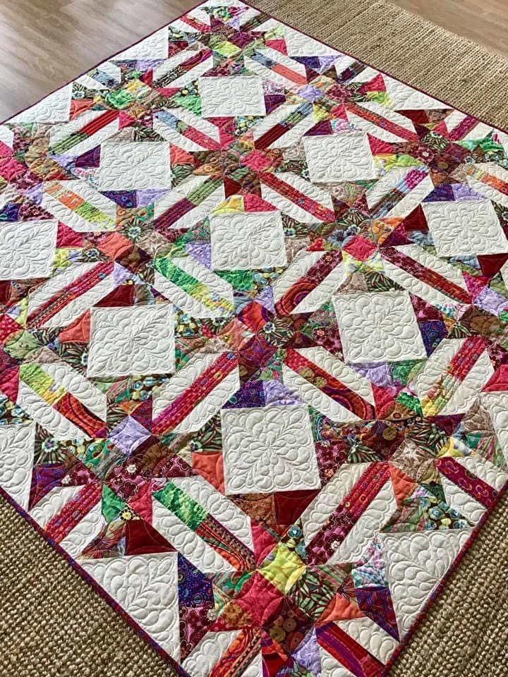 I have been doing a few online mystery quilt projects during this time of self isolation. This one was designed by Rachelle Denneny as a fund raiser for Backpacks 4 kids SA Inc. It was a great way to use up lots of my bright Kaffe Fassett scraps. The design called for brights with a contrasting background. I chose this layout as it provided lots of opportunities for custom quilting designs.