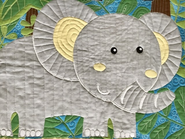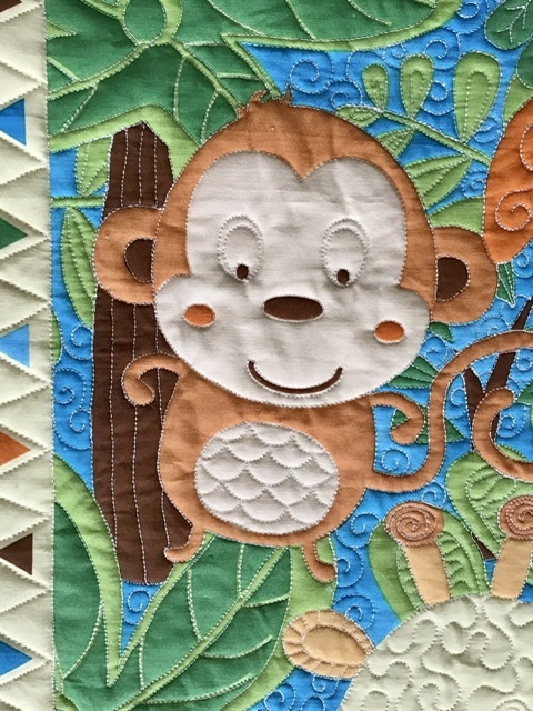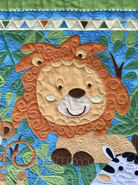 An excellent way to experiment and develop your free motion machine quilting is to play with a fabric panel. Here is a cot panel I have been enhancing . . It lets you be creative and experiment with different fill designs plus allows you to quilt on the printed lines ( similar to quilting in the ditch) to outline each shape. A quick and easy way to prepare a cute quilt for someone special.