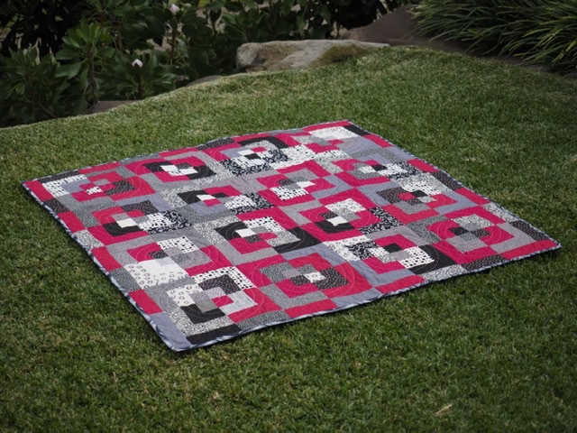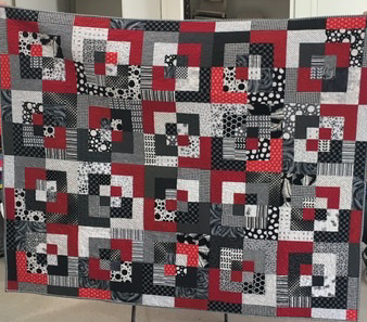 We were donated a large tub of red and black fabrics, which we cut into 2 1/2 inch squares. After a productive morning of stitching we had 2 finished quilt tops, using the Bento Box pattern to make 12 inch blocks.