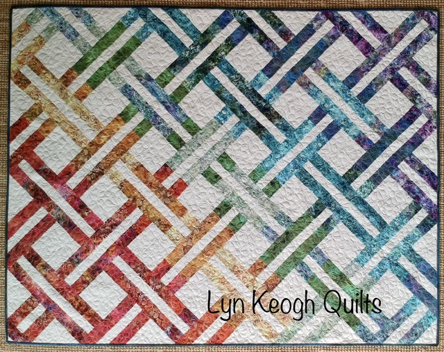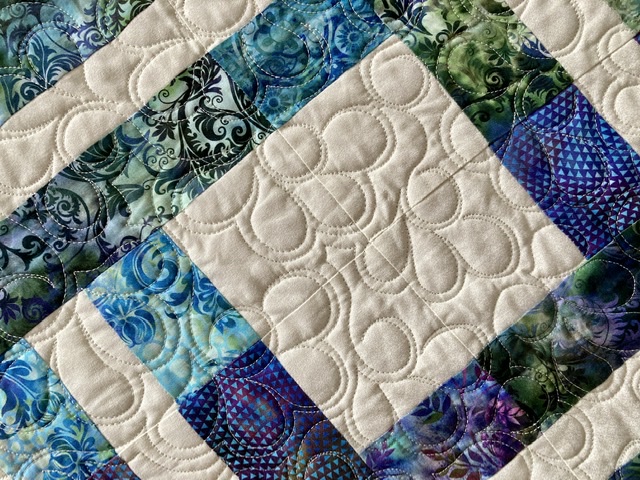 The colours are bright and fresh. I have quilted it with an all over hook and feather design. An all over repetitive design is a good way to help build up confidence in just ’going for it’ when quilting a continous pattern.