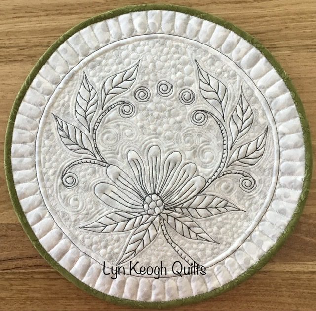 I used a cream cotton for the background so that the subtle cross hatch pattern on the fabric showed through the image. The design is outline quilted in black thread, then free motion quilted with a cream in the background. The black outline quilting can be clearly seen in the back of the placemats.