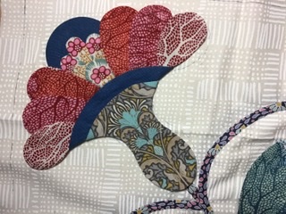 A new project is slowly coming together. Lots of fun fussy cutting the new Tilda fabric range, Cotton Beach. I am trying a new method of appliqué for me, where the freezer paper is on the wrong side of the appliqué piece, all turned under and ironed before sewing onto the background…..it seems to be working well.