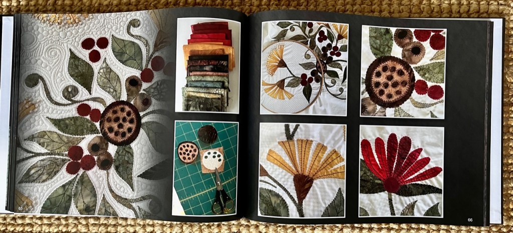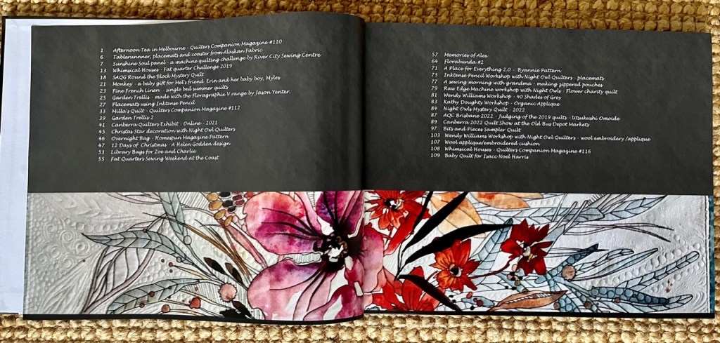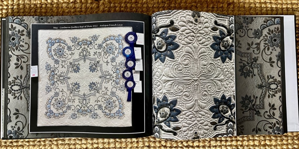 It is not an arduous task if you record each project as you complete it. The book project sits on my computer. Photos and notes are added once I have finished each quilt. This also keeps a chronological order of my work. When the book reaches its page limit, I then order and send the files to the ‘photo book’ company. My books are hardcover, 100 pages, size 26cm X 33 cm. This size allows me to include some closeup photos of special details or quilting designs.