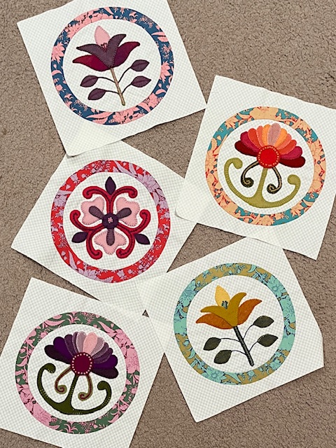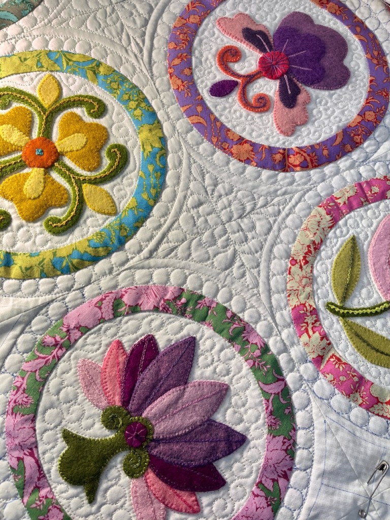 I have been working on a new quilt that incorporates appliqué and embroidery using wool felt. It has been a very relaxing activity at night to sit and sew, creating different effects with the wool embroidery. Sue Spargo’s creative stitching provided some great inspiration. I used a range of tilda fabrics for the circles and tried to match the wool felt with the colour shades in each block.