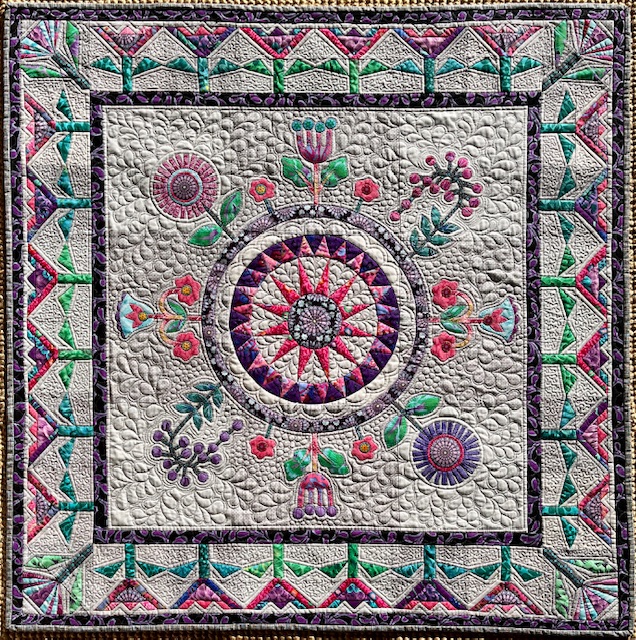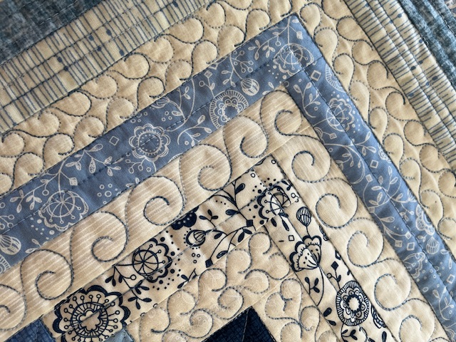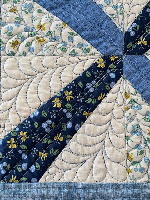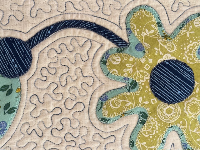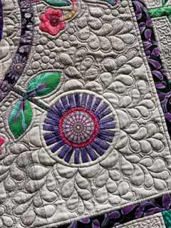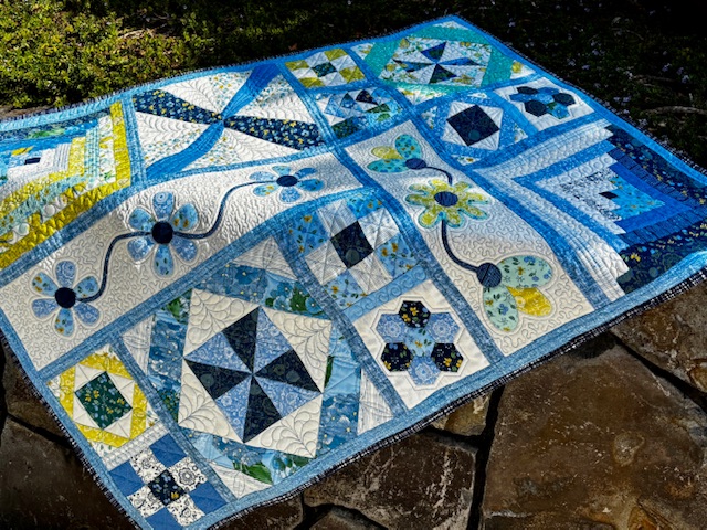 I had many workshop samples and decided to incorporate them into a single quilt. There were enough blocks to make a lovely cot size quilt. I had fun free motion quilting each block.