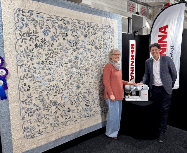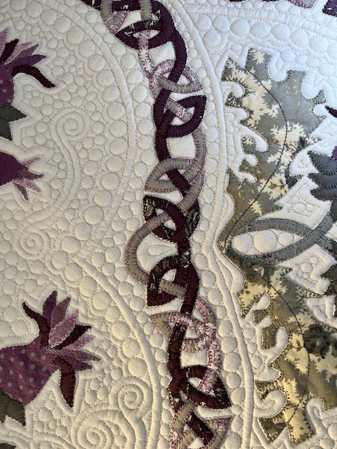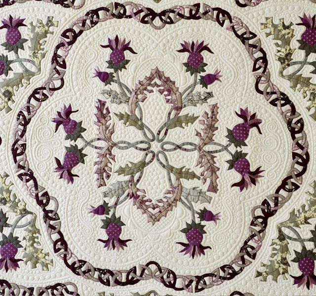 This quilt was inspired by my eternity ring, bought by my husband on a family holiday to The Isle of Skye, Scotland. The Celtic symbol of eternity is depicted in the intertwining bands. The floral design and colours are based on Scottish thistles, inspired by my husband’s Scottish heritage.