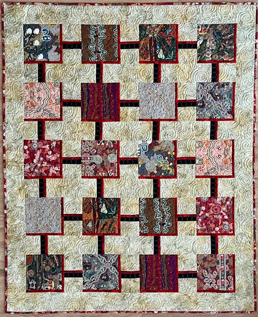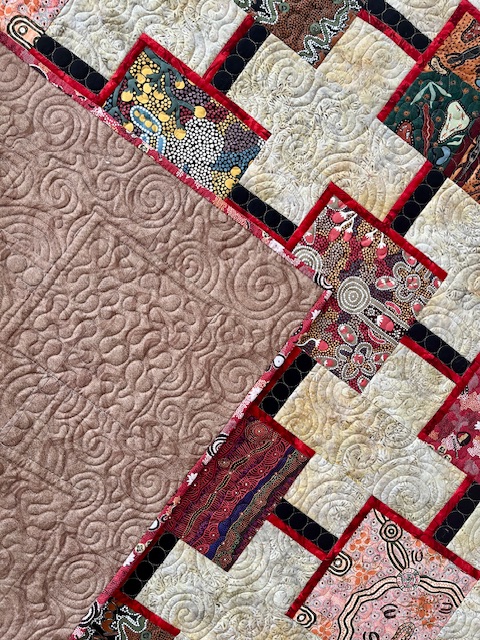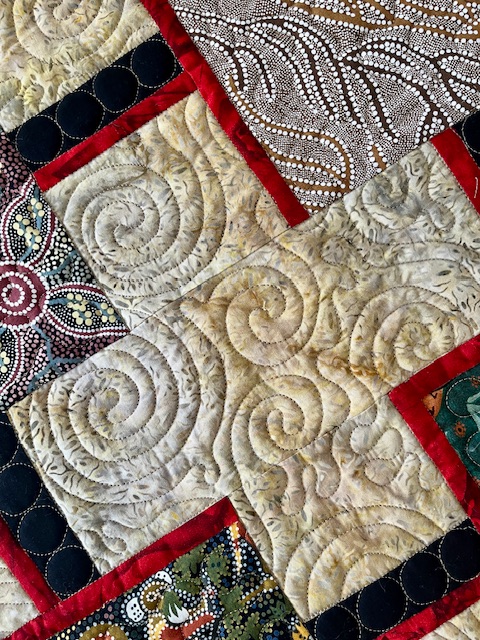 I also used up some of my stash in an ‘aboriginal print’ inspired pieced quilt. I adapted a design found on Pinterest and machine quilted it on my new Bernina Q20.