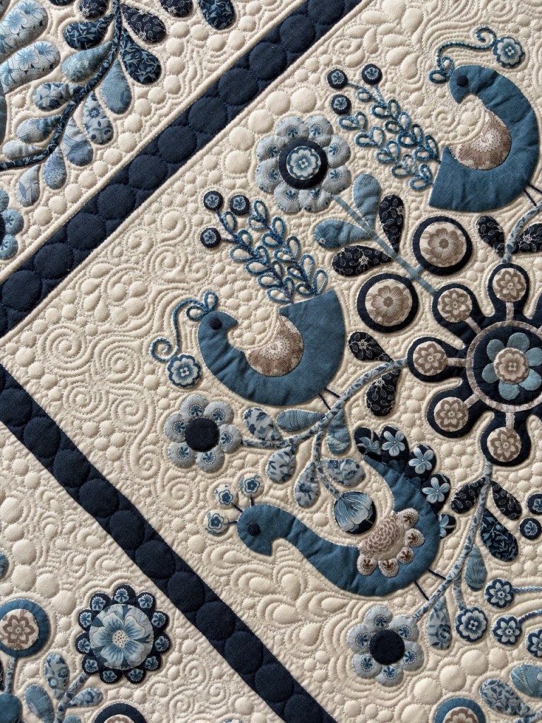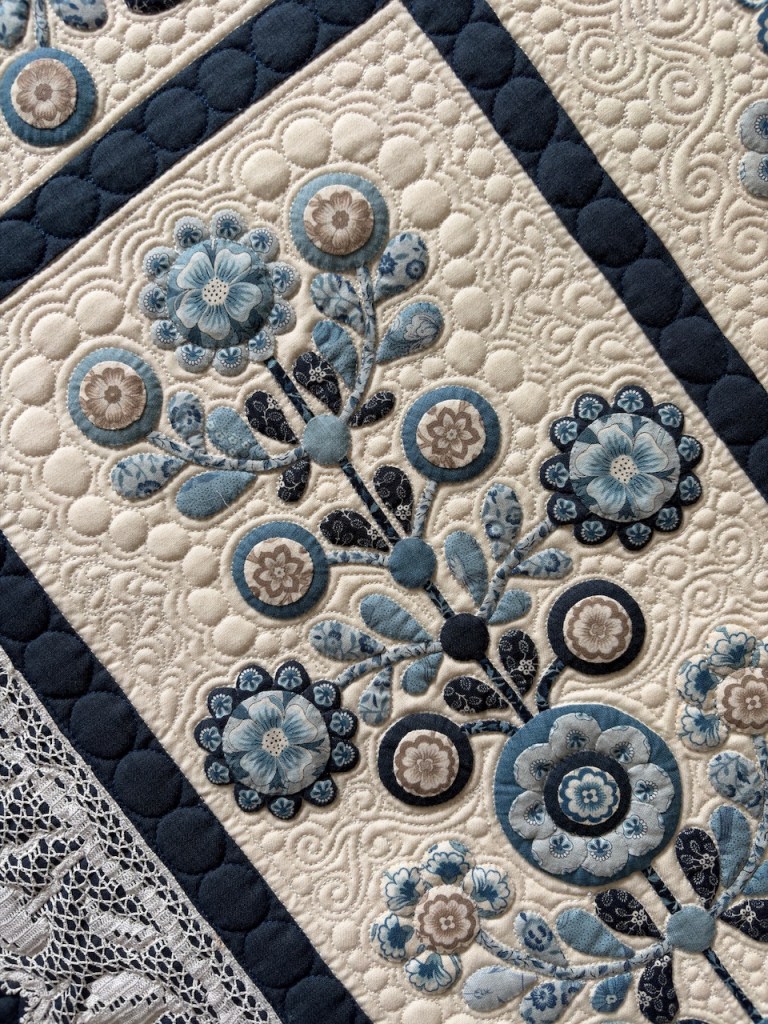 I hand appliquéd it onto the blue fabric before quilting in a cream thread along the heavier sections of the lace pattern. Really happy with how it looks, with slight ‘puffiness’ being created in the design. I then outline quilted in navy blue along the edges and added a band of circles all around the outside.